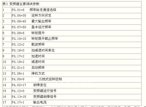 電壓提升參數(shù):P0.09=6% 啟動時電壓提升的數(shù)值。P0.10=10Hz 轉(zhuǎn)矩提升截止頻率。變頻器主要調(diào)試參數(shù)如表3所示。