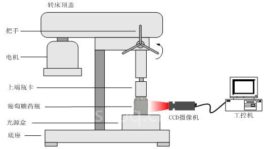 基于機器視覺技術(shù)的葡萄糖藥液質(zhì)量檢測,可以實現(xiàn)無接觸式的檢測,在藥品安全上和檢測精度上都對傳統(tǒng)人工檢測有著重大的改進。根據(jù)葡萄糖藥液雜質(zhì)檢測的特點設計了專用的視覺成像方案。如下圖所示,待檢測的葡萄糖藥瓶被卡在轉(zhuǎn)床上,轉(zhuǎn)床旋轉(zhuǎn)的時候帶動藥瓶高速旋轉(zhuǎn),用于機器視覺的專用LED光源安裝在如圖所示的光源盒內(nèi),CCD攝像將拍攝到的圖像傳輸?shù)?span id="q4clsxb5" class=hrefStyle>工控機。在此過程中連續(xù)拍攝7幅圖像,在這一序列的運動圖像中,對運動目標進行識別; 當識別到的目標超過規(guī)定的容許指標時,判斷此瓶藥液為不合格。