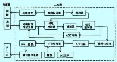 系統(tǒng)主要由傳感器和二次表組成。二次表主要由高頻振蕩器、可編程信號(hào)放大器、相敏檢波器、濾波器、幅度鑒別器、agc電路、線性化處理等電路構(gòu)成。本文就系統(tǒng)關(guān)鍵部分電路的原理及作用加以論述。