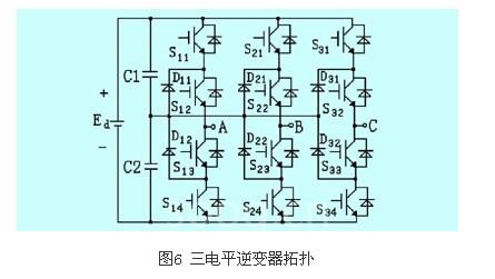 日本長(zhǎng)岡科技大學(xué)的等人于1980提出三電平逆變器,也稱中點(diǎn)箝位式(neutral pointclamped:npc)逆變器。經(jīng)過多年的研究,出現(xiàn)了兩種主要的拓?fù)浣Y(jié)構(gòu):二極管箝位式;飛跨電容式。二極管箝位式拓?fù)淙鐖D6。