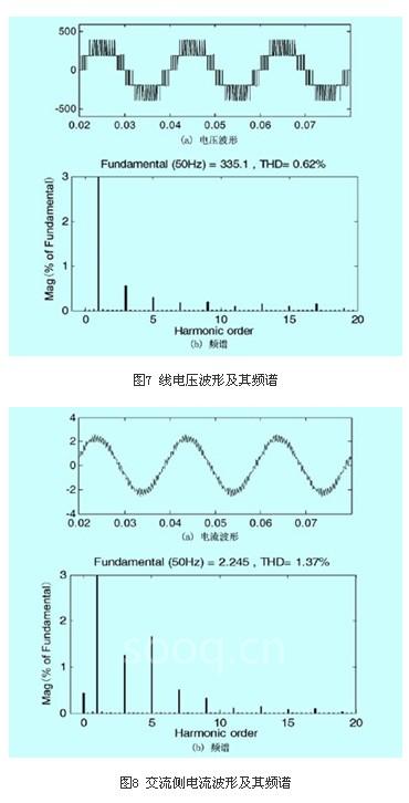 圖7、8為三電平逆變器輸出電壓、電流波形及其頻譜。