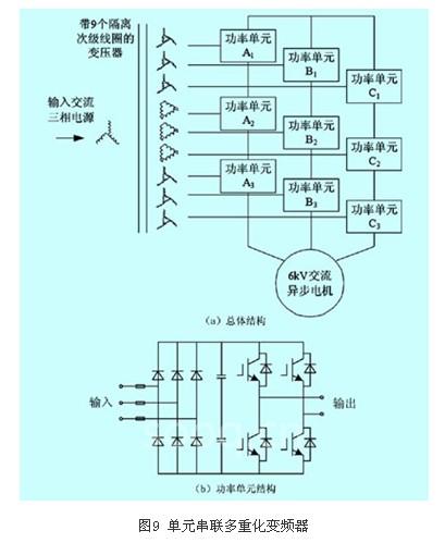 單元級(jí)聯(lián)多重化結(jié)構(gòu)是對(duì)多重化技術(shù)的推廣和應(yīng)用,是多重化變頻器的一種。如圖9所示,單元級(jí)聯(lián)多重化變頻器采用若干個(gè)低壓pwm變頻功率單元串聯(lián)的方式實(shí)現(xiàn)直接高壓輸出,電平數(shù)的增加有效的抑制了輸出諧波。由于每個(gè)功率單元模塊中除了含有逆變輸出結(jié)構(gòu)外,同時(shí)含有整流功能,從而相應(yīng)的實(shí)現(xiàn)了整流部分的多重化,使得變頻器輸入、輸出諧波抑制同步完成。其諧波抑制原理與普通多重化相似,也是利用相移技術(shù),使每個(gè)功率模塊的某些次輸出諧波相互錯(cuò)開一定的角度而被消除。
