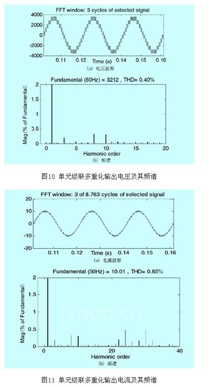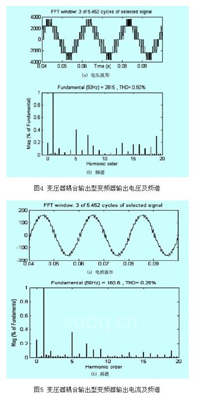 變壓器耦合輸出型逆變器的輸出波形可等效為7電平線電壓pwm波,優(yōu)于普通二電平變頻器,dv/dt也較低,只含有非常小的低次諧波,thd值也很低,但高次諧波仍然存在,如23、25次諧波等,這主要是由于每個(gè)獨(dú)立的逆變器采用pwm調(diào)制而造成的,采用更好的調(diào)制策略或增加一個(gè)小容量的低通濾波器可以解決這一問題。