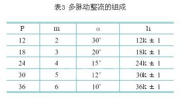 多重移相疊加技術(shù)是由k等人早在1962年提出的。該技術(shù)采用脈動(dòng)寬度為60°的6脈動(dòng)三相全波整流(或等效三相全波整流)作為基本單元,使m組整流電路的交流側(cè)電壓依次移相α=60°/m,則可組成脈動(dòng)數(shù)為p=6m的多脈動(dòng)整流。其脈動(dòng)數(shù)p、組數(shù)m、移相角α及對(duì)應(yīng)的諧波次數(shù)h之間的關(guān)系如表3所示。