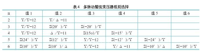 對(duì)于18脈動(dòng)及以上的整流,整流變壓器繞組采用曲折接線(z接線)實(shí)現(xiàn),各整流單元并聯(lián)(或串聯(lián)),共同向負(fù)載供電。只要滿足m組6脈動(dòng)整流交流側(cè)的電壓u(n)(n=1,2,……,m)依次移相α=60°/m,即可得到p=6m脈動(dòng)的多相整流。具體變壓器組別選擇情況如表4。