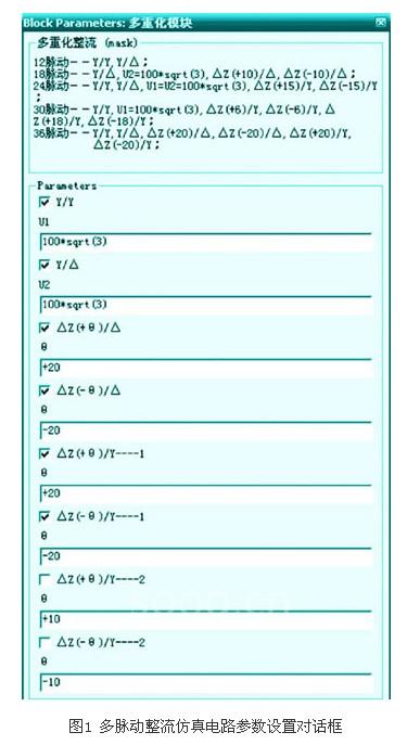 利用matlab中的simulink/powersystem工具箱對(duì)多脈動(dòng)整流仿真研究。本文構(gòu)建了多重化整流的統(tǒng)一分析模塊,設(shè)置參數(shù)后,使其能夠?qū)崿F(xiàn)12、18、24、30、36脈動(dòng)整流電路的工作特性。按照參數(shù)面板中相關(guān)說明,選擇合適的變壓器接法,并輸入相移角度,即可實(shí)現(xiàn)相應(yīng)脈動(dòng)數(shù)的多重化整流仿真分析。多脈動(dòng)整流輸入仿真電路的參數(shù)設(shè)置面板如圖1所示。