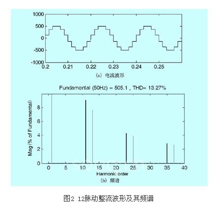 以12脈動(dòng)的仿真為例,波形及頻譜如圖2所示,可以看出12脈動(dòng)時(shí)主要諧波為12k±1次,和理論分析相符合。
