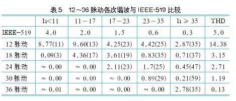 結(jié)合ieee-519中的標(biāo)準(zhǔn),對(duì)各脈動(dòng)數(shù)整流進(jìn)行比較如表5所示,可見,在不增加其他濾波裝置的情況下,12脈動(dòng)整流很能滿足ieee-519中的要求,在各個(gè)范圍內(nèi)諧波含量均超出標(biāo)準(zhǔn)。36脈動(dòng)情況要好的多,35次以下諧波及thd都能滿足ieee-519的要求,但仍然含有較大的35、37等次的諧波。