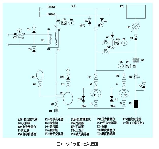 板式換熱器ph1通過(guò)外部循環(huán)水對(duì)變頻器內(nèi)部乙二醇水溶液進(jìn)行冷卻,調(diào)節(jié)閥cv1根據(jù)內(nèi)部水溫控制開(kāi)、關(guān)以保證變頻水溫度變化在允許范圍內(nèi)。二臺(tái)水泵p1、p2互為備用,將水泵入直流母線(xiàn)和環(huán)繞型gto,單向閥bv1、bv2阻止回流。放氣罐dv1用于儲(chǔ)存水溶液,并分離氣體,通過(guò)自動(dòng)放氣閥adv1排氣。ev1與放氣罐dv1聯(lián)通,用于提供系統(tǒng)基本壓力。