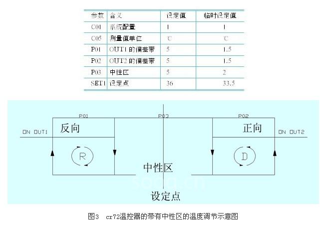 首先對(duì)壓力系統(tǒng)檢測(cè),證明壓力表指示正常,壓力檢測(cè)回路無(wú)誤。在室溫下,變頻器不工作,只在水泵運(yùn)行時(shí),系統(tǒng)壓力在4.25bar左右,壓力正常。故障一時(shí)查不清楚,而當(dāng)時(shí)生產(chǎn)不允許長(zhǎng)時(shí)間停車(chē),決定采取臨時(shí)措施開(kāi)車(chē),即將控制調(diào)節(jié)閥的溫控器cr72溫度范圍縮小。溫控器采用帶有中性區(qū)的溫度調(diào)節(jié)如圖3所示,輸出out1作為反向(關(guān)閥)操作,并在測(cè)量值低于設(shè)定值set1-p03/2-p01時(shí)有效,輸出保持有效直到測(cè)量值返回到set1-p03/2時(shí)為止;輸出out2作為正向(開(kāi)閥)操作,并在測(cè)量值高于設(shè)定值set1+p03/2+p02時(shí)有效;輸出保持有效直到測(cè)量值返回到set1+p03/2時(shí)為止。主要參數(shù)表修改如附表所示,使溫度調(diào)節(jié)范圍縮小。