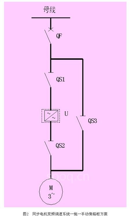 變頻器選用利德華福 hasvert-s06/130同步電機(jī)變頻調(diào)速系統(tǒng),旁路方案選用一拖一手動旁路柜,如圖2所示。