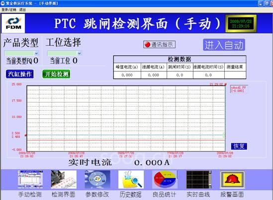 PTC自動(dòng)檢測界面,進(jìn)入系統(tǒng)后首先檢測PLC通訊狀態(tài)及氣壓狀態(tài)、不良品計(jì)數(shù)等,不符合條件不允許進(jìn)行操作。