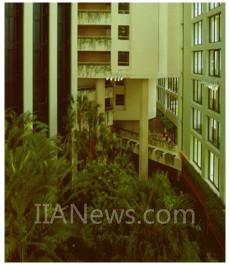 本案設(shè)計(jì)一座綠意盎然的生態(tài)中庭,在中庭中設(shè)置一座光亮輕巧的樓梯,讓管理者、員工在上班時(shí)可穿梭在綠意之中,所有員工上下樓層時(shí)喜歡以走樓梯方式代替非人性化的電梯,以便創(chuàng)造健康活潑的工作環(huán)境。生態(tài)中庭上北面垂直側(cè)面采透明天窗設(shè)計(jì)以避免直達(dá)日射,并引進(jìn)愉快的北面自然采光。天窗之部分玻璃面采用Low-E玻璃與使用太陽能光電板,降低直射陽光的輻射熱,阻止直射日光進(jìn)入室內(nèi),可節(jié)省10%空調(diào)能源,大量降低空調(diào)能源的消耗。生態(tài)中庭如圖3所示。