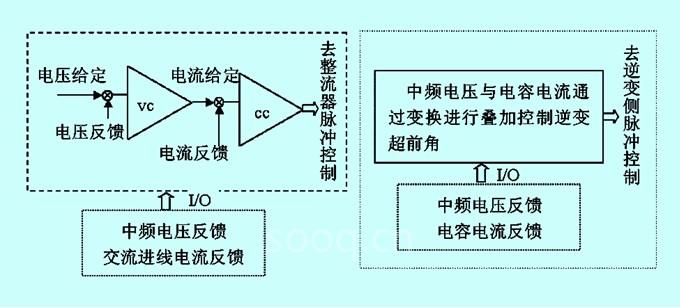 控制系統(tǒng)采用電壓、電流雙閉環(huán)控制,控制框圖如圖2所示。通過對中頻電壓的檢測,來控制中頻輸出電壓的大小,電壓調(diào)節(jié)器的輸出作為電流給定。通過檢測三相交流進(jìn)線電流來作為電流反饋,電流調(diào)節(jié)器的輸出控制整流器的脈沖移相??刂葡到y(tǒng)檢測中頻電壓、電容器支路電流,通過計算與比較,來控制逆變晶閘管的觸發(fā),保證反壓時間tβ大于晶閘管關(guān)斷時間tq。