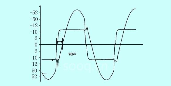 ?。?)測試中頻電壓與電流波形如圖3所示,中頻頻率大約1.7khz,周期t為589μs,電流超前電壓達(dá)70μs,即功率因數(shù)角大約為:70/589×360=43°。本中頻裝置用晶閘管的恢復(fù)時間大約在20μs,為了保證晶閘管的可靠關(guān)斷,系統(tǒng)設(shè)置的電流超前電壓大約在40μs左右。