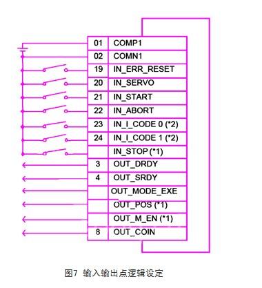 giii驅(qū)動器有12個輸入點(diǎn)可以使用,其邏輯與定義可以任意改變(見圖7),功能包括servo-on、start、stop、連續(xù)運(yùn)行、輸入點(diǎn)選擇等。這里的應(yīng)用要使用輸入點(diǎn)選擇,即code_1、code_2、等,根據(jù)需要執(zhí)行的table號碼,比如設(shè)定的004號table執(zhí)行的命令是正向旋轉(zhuǎn)90°,只要設(shè)定inpit1、input2、input3,3個輸入點(diǎn)就可以對table選擇進(jìn)行編碼,004對應(yīng)的是100,即input3為高電平,其它為低電平,就旋轉(zhuǎn)了004號table。輸入點(diǎn)servo-on、start、stop也是必不可少的,servo-on之后然后start,這樣就會完成正向90度的運(yùn)行。