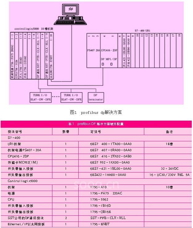 ?。?) profibus dp解決方案原理與配置設(shè)計(jì)。profibusdp方案的通訊配置圖如圖1所示。圖中controllogix5000通過(guò)第三方sst公司的dp通訊模塊sst-pfb-clx-rl做主站,帶turk的bl67系列dp遠(yuǎn)程i/o,然后又通過(guò)另一塊dp通訊模塊做主站,s7-400plc的cpu416做從站,完成了兩種類型控制器的dp通訊。做主站的dp通訊模塊sst-pfb-clx-r,用sst profibus通訊配置軟件完成dp通訊配置。該方案測(cè)試需要的硬件配置如表1所示。