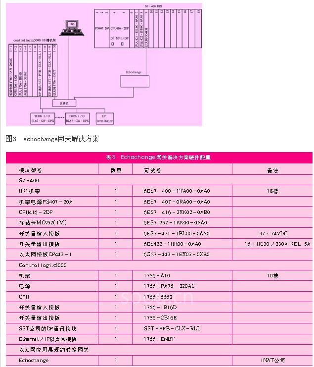?。?) 方案評(píng)析。該方案與方案2類似,只不過(guò)將網(wǎng)關(guān)換成了ethernet/ip到profinet(以前叫industrial ethernet)的echochange,該網(wǎng)關(guān)兩邊都采用的是以太網(wǎng),只是應(yīng)用層規(guī)約不同,該方案以低的硬件和組態(tài)成本,實(shí)現(xiàn)了兩個(gè)已有的以太網(wǎng)網(wǎng)絡(luò)之間的簡(jiǎn)易連接,但經(jīng)過(guò)該網(wǎng)關(guān)進(jìn)行的數(shù)據(jù)交換僅限于整數(shù)。與2.1方案相比,該方案省去了一個(gè)第三方(sst)的dp通訊模塊,且echochange網(wǎng)關(guān)的成本比用s7-300搭dp-profinet的網(wǎng)關(guān)要低,運(yùn)行的可靠性高,這也是siemens公司推薦的與ab公司plc控制器的以太網(wǎng)連接方案。