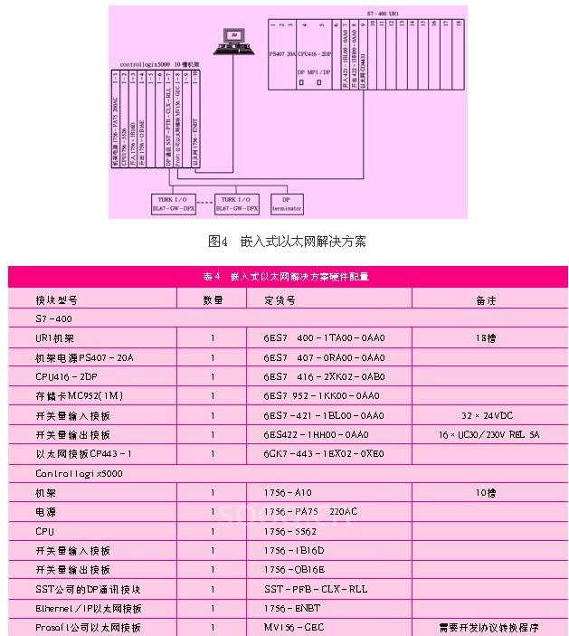 ?。?)嵌入式以太網(wǎng)解決方案原理與配置設(shè)計(jì)。嵌入式以太網(wǎng)解決方案采用可插在controllogix5000機(jī)架內(nèi)的prosoft公司生產(chǎn)的以太網(wǎng)模板,自主編程后,直接實(shí)現(xiàn)controllogix5000與s7-400的以太網(wǎng)通訊。該方案的通訊配置圖如圖4所示。該方案測(cè)試需要的硬件配置如表4所示。
