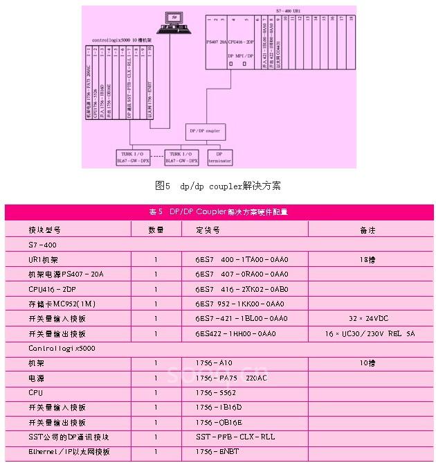 (1) dp/dp coupler解決方案原理與配置設(shè)計(jì)。在已有dp網(wǎng)上掛dp/dp coupler,采用dp網(wǎng)與s7-400的cpu通訊。該方案的通訊配置圖如圖5所示。該方案測(cè)試需要的硬件配置如表5所示。