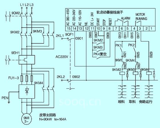 電動(dòng)機(jī)主回路由斷路器9qm2,正反轉(zhuǎn)控制接觸器9km2、9km3,旁路運(yùn)行接觸器9km4,熱繼電器9eh1、半導(dǎo)體保護(hù)熔斷器fu1-3,軟起動(dòng)器siemens—3rw2236組成。
