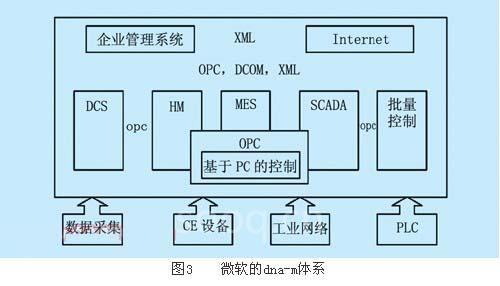 現(xiàn)在opc技術(shù)的發(fā)展已經(jīng)超出了原來取代驅(qū)動(dòng)程序的初衷,而成為微軟公司的制造業(yè)分布式網(wǎng)間應(yīng)用程序體系結(jié)構(gòu)(dna-m,distributed internet application architecture for manufacturing)的核心,如圖3所示。