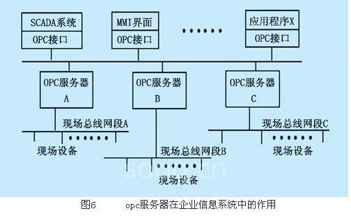 opc開發(fā)的目的是為了給工業(yè)控制系統(tǒng)應(yīng)用程序之間的通訊建立一個(gè)接口標(biāo)準(zhǔn),在工業(yè)控制設(shè)備與控制軟件之間建立統(tǒng)一的數(shù)據(jù)存取規(guī)范,這個(gè)接口規(guī)范不但能夠應(yīng)用于單臺(tái)計(jì)算機(jī)內(nèi)部,而且可以支持網(wǎng)絡(luò)上分布式應(yīng)用程序之間通訊,以及不同平臺(tái)上應(yīng)用程序間的通訊。opc的基礎(chǔ)-微軟的ole/com及dcom技術(shù)完全支持上述分布式應(yīng)用和異構(gòu)環(huán)境下應(yīng)用的無縫集成。opc服務(wù)器在企業(yè)信息系統(tǒng)中的作用表現(xiàn)為,opc服務(wù)器在底層控制系統(tǒng)中采用統(tǒng)一標(biāo)準(zhǔn),實(shí)現(xiàn)了應(yīng)用程序與現(xiàn)場設(shè)備的有效連接,發(fā)揮了橋梁作用,促進(jìn)了企業(yè)現(xiàn)場控制層和過程監(jiān)控層、生產(chǎn)管理層以及經(jīng)營決策層的集成。opc服務(wù)器在企業(yè)信息系統(tǒng)內(nèi)的作用如圖6所示。