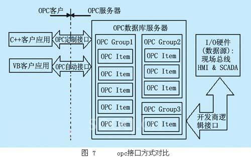 這兩種接口的關(guān)系如圖7所示。對(duì)于服務(wù)器端開發(fā),opc技術(shù)規(guī)范規(guī)定opc服務(wù)器必須提供自定義接口,而自動(dòng)化接口可以有選擇地提供。對(duì)于客戶端開發(fā),可以選擇訪問兩種接口的任意一種。一般來說,自定義接口的功能比較強(qiáng)大,需要掌握com技術(shù),而自動(dòng)化接口的開發(fā)比較容易,缺點(diǎn)是易受接口本身功能的限制。