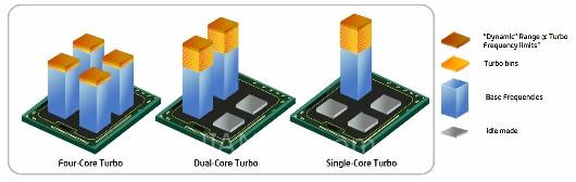 其次,第三代Intel Core處理器優(yōu)化了設(shè)計,可以提供功耗和性能的最優(yōu)匹配。 處理器運行在功耗、電流計溫度限制以下時,Intel?智能加速技術(shù)2.0(Intel? Turbo Boost Technology 2.0)允許處理器自動超頻。 該特性對于不會占用所有處理器內(nèi)核的應(yīng)用尤其有用。 在這樣的應(yīng)用中,沒有使用的內(nèi)核可以關(guān)閉,使得正在使用的內(nèi)核超頻運行(如圖3所示)。 其他的升級中,該特性的2.0版本定義了更多的加速方法,允許處理器更加密切的跟蹤可用功率預(yù)算。 其他的性能升級包括:新推出的低功耗模式,這一模式通過如為最低頻率模式引入空閑內(nèi)核等技術(shù),降低了標(biāo)量TDP以下的活動功耗。