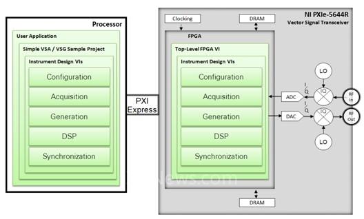 圖2. NI PXIe-5644R矢量信號(hào)收發(fā)器的架構(gòu)可允許在主機(jī)或設(shè)備固件中仿真和部署用戶可編輯的DSP塊。同時(shí)也可以對(duì)其他輸入/輸出以及內(nèi)存接口進(jìn)行修改以作為算法設(shè)計(jì)的補(bǔ)充。