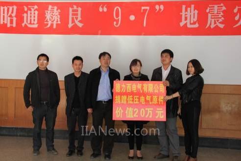 當(dāng)日在云南彝良舉行了簡單樸素的捐贈(zèng)儀式,德力西電氣有限公司國內(nèi)渠道銷售部滇貴區(qū)經(jīng)理呂志斌,彝良縣副縣長危愛芳及當(dāng)?shù)毓╇姽鞠嚓P(guān)領(lǐng)導(dǎo)出席了捐贈(zèng)儀式。帶著對(duì)彝良災(zāi)區(qū)人民的深情牽掛,德力西電氣向彝良捐贈(zèng)了總計(jì)八百余臺(tái)不同型號(hào)的斷路器和三百余臺(tái)的電能表等設(shè)備。當(dāng)?shù)毓╇姴块T負(fù)責(zé)人表示,“德力西電氣是第一家也是唯一一家參與到此次彝良災(zāi)區(qū)援建工作的電氣企業(yè),我們非常感激。在前期溝通中,德力西電氣與我們供電等部門多次接洽,問詢?yōu)膮^(qū)當(dāng)前的迫切需要,并制定了隨后援助工作的具體實(shí)施計(jì)劃。德力西電氣捐贈(zèng)的電器物資針對(duì)性很強(qiáng),將對(duì)災(zāi)區(qū)受損電力設(shè)備的盡快恢復(fù)重建起到至關(guān)重要的作用?!?BR> 作為國內(nèi)中檔低壓電氣的領(lǐng)軍企業(yè),德力西電氣一方面堅(jiān)持產(chǎn)品的推陳出新,一方面長期致力于系列公益活動(dòng)的開展。今年以來德力西電氣業(yè)已陸續(xù)開展志愿服務(wù)敬老院、建立慈善基金、援建希望小學(xué)等一系列有組織有計(jì)劃的奉獻(xiàn)愛心活動(dòng),積極履行了企業(yè)社會(huì)責(zé)任。