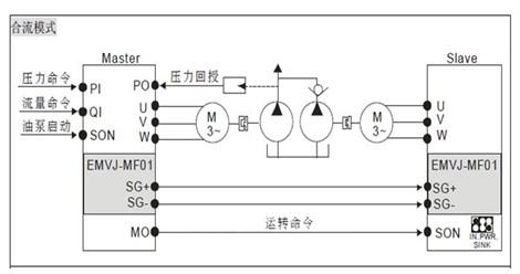 臺達(dá)雙泵合流驅(qū)動產(chǎn)品通過伺服控制器的485總線實現(xiàn)對分系統(tǒng)的協(xié)調(diào)控制,用合流后的壓力作為壓力反饋。上位機的給定壓力和流量命令信號接入主泵(控制器),主泵通過485總線將數(shù)字命令傳輸給從泵,合流控制中的各個伺服控制器根據(jù)應(yīng)用需求確定最節(jié)能的工作狀態(tài),協(xié)同控制各電機的力矩和轉(zhuǎn)速,確保系統(tǒng)壓力和流量的快速響應(yīng),壓力和流量的穩(wěn)定,以及制成過程中的平穩(wěn)轉(zhuǎn)換。