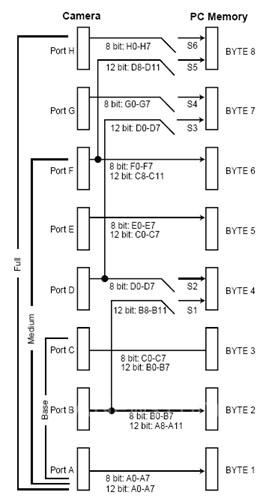 如圖2所示, Camera Link標準提供了三種組態(tài):Base、Medium與Full信號模式。來自工業(yè)相機的圖像數(shù)據(jù),通過指定的端口傳送至相對應(yīng)的圖像采集卡端口。Base組態(tài)包含一組傳送器/接收器,24 bits的視頻數(shù)據(jù)分為A、B、C三個8-bit端口,外加FVAL(視頻有效)、LVAL(線路有效)、DVAL(數(shù)據(jù)有效)及其他備用信號、一個頻率信號、一個序列通道以及四個LVDS一般用途工業(yè)相機控制信號。一般而言,工業(yè)相機控制信號通常是用于外部觸發(fā),以達到實時圖像采集。在使用20~85 MHz頻率之下,圖像數(shù)據(jù)傳輸率可高達2.04 Gbps。Medium組態(tài)增加第二組傳送器/接收器對,使圖像數(shù)據(jù)位倍增為48 bits(8-bit端口也倍增為六個:A、B、C、D、E、F)、圖像數(shù)據(jù)傳輸率倍增為4.08 Gbps。Full組態(tài)再次增加圖像數(shù)據(jù)位為64 bits,使用八個8-bit端口:A、B、C、D、E、F、G、H,提高圖像數(shù)據(jù)傳輸率為5.44 Gbps。Camera Link數(shù)據(jù)傳輸路徑,請參閱圖3。