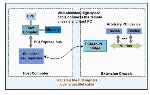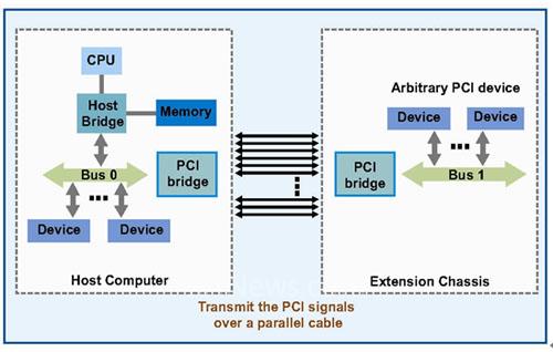 PCI?是以33MHz運作的32位總線,在過去,最常見的PCI?擴展技術就是直接鏈接PCI?總線信號及擴展機箱,再以主機操控。然而,這樣的擴展方式有許多的缺點。首先,經由屏蔽線纜傳輸33MHz的頻率信號時,信號會隨著纜線的長度遞增而衰減。因此,此種解決方案的擴展距離只能限制在1.5米內。其次,透過纜線所傳輸的頻率信號會受到高度的干擾且無法修正,如此嚴重的干擾會造成系統(tǒng)的損壞。