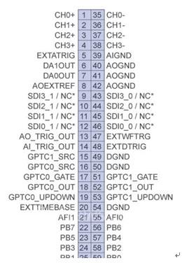 舉個(gè)例子來(lái)說(shuō)明,下圖是凌華 DAQ-2010 的信號(hào)定義。腳位 5 為專用的 AI模擬觸發(fā)輸入,腳位 48 是專用的 AI 數(shù)字觸發(fā)輸入,腳位 47 是專用的 AO 數(shù)字觸發(fā)輸入。另外通道 1到通道 4 都可以作為模擬觸發(fā)的輸入。