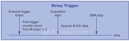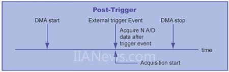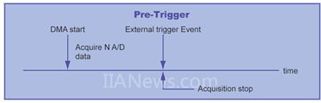Post-trigger 是最簡(jiǎn)單的觸發(fā)模式。當(dāng)用戶下達(dá)開(kāi)始采集的命令后,F(xiàn)PGA 或 PLD 會(huì)啟動(dòng) DMA 并等待觸發(fā)事件。當(dāng)觸發(fā)發(fā)生后立即開(kāi)始采樣,直到滿足用戶設(shè)定的采樣點(diǎn)數(shù)或用戶下達(dá)停止命令為止。諸如突波檢測(cè)、多張數(shù)據(jù)采集卡的同步都可以使用這種觸發(fā)模式。