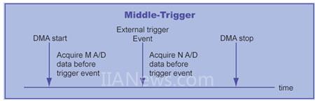 Middle-trigger 是 pre-trigger 的延伸。在 middle-trigger 中,用戶可以同時(shí)取得觸發(fā)事件前后的數(shù)據(jù)。如上圖所示,用戶可以指定 M (觸發(fā)前) + N (觸發(fā)后) 筆數(shù)據(jù),用以觀察在觸發(fā)前后信號(hào)變化的情形。