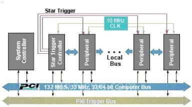 PXI 觸發(fā)總線(xiàn)是由八個(gè)信號(hào)組成,各擴(kuò)充槽皆連接至此總線(xiàn),而透過(guò)PXI 觸發(fā)總線(xiàn),亦可達(dá)到同步的功能。但因?yàn)槠淇偩€(xiàn)之特性,所以時(shí)脈歪斜之精確度僅要求至小于10ns。利用PXI觸發(fā)總線(xiàn),可以于其上傳輸觸發(fā)信號(hào),甚或是數(shù)據(jù)擷取的時(shí)脈信號(hào)。