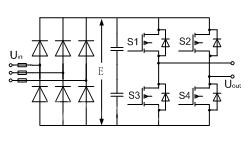 單元串聯(lián)型高壓變頻器采用若干個(gè)低壓功率單元串聯(lián)的方式實(shí)現(xiàn)直接高壓輸出,其結(jié)構(gòu)如圖1所示,采用的變壓器為多重化隔離變壓器,一次側(cè)輸入高壓,二次側(cè)輸出相互隔離的低壓,供給各個(gè)功率單元,即圖中的各個(gè)H橋,系統(tǒng)的三相結(jié)構(gòu)類似。每個(gè)功率單元都是一個(gè)三相輸入、單相輸出的交-直-交變頻器,具有統(tǒng)一的結(jié)構(gòu),功率單元的結(jié)構(gòu)如圖2所示。