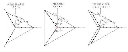 為了在單元故障后充分利用所有的非故障單元,進(jìn)一步提高多電平逆變器的輸出性能,可以采用中性點(diǎn)移位技術(shù)。中性點(diǎn)移位原理是利用變頻器的中性點(diǎn)是浮動(dòng)的,且不連接到負(fù)載中點(diǎn)(例如目前廣泛應(yīng)用的三相電動(dòng)機(jī)),因此變頻器中性點(diǎn)可以偏離負(fù)載中點(diǎn)。盡管變頻器輸出三相相電壓不平衡,但通過調(diào)整相電壓的相位可以得到三相平衡的負(fù)載線電壓。這樣的調(diào)整方式,相當(dāng)于故障后在各相剩余單元輸出的不對(duì)稱電壓上共同疊加一個(gè)零序分量,以合成三相對(duì)稱的線電壓。由于兩個(gè)中點(diǎn)不直接連接,因此該線電壓在負(fù)載上可以產(chǎn)生對(duì)稱的負(fù)載相電壓,從而保證負(fù)載的對(duì)稱穩(wěn)定運(yùn)行。但是由于三相不再對(duì)稱,此時(shí)通過注入三次諧波以提高單元電壓利用率的優(yōu)化控制方法不再適用,因此,中性點(diǎn)移位的處理方式并沒有充分利用系統(tǒng)的最大輸出能力。某些故障狀態(tài)下,其最大輸出能力甚至比傳統(tǒng)的屏蔽故障單元及其對(duì)應(yīng)另外兩相非故障單元的處理方式還要低。