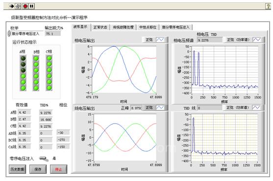 單元串聯(lián)型高壓變頻器利用若干低壓功率單元串聯(lián)實(shí)現(xiàn)高壓輸出,這種結(jié)構(gòu)使其具有良好的容錯(cuò)性能;將發(fā)生故障的單元屏蔽后,通過一定的故障處理方法,可以使系統(tǒng)繼續(xù)降低容量運(yùn)行,保證生產(chǎn)的穩(wěn)定運(yùn)行。傳統(tǒng)的故障處理方法是采用屏蔽掉故障單元與另外兩相中相應(yīng)的非故障單元,以保持變頻器的平衡運(yùn)行,這樣勢(shì)必會(huì)造成非故障單元的浪費(fèi),因此對(duì)級(jí)聯(lián)型變頻器正常工作及故障時(shí)處理方法的研究很有必要。本文設(shè)計(jì)的基于PCI-9846的變頻器輸出性能測(cè)試系統(tǒng)主要針對(duì)采用三種不同的故障處理方法時(shí),對(duì)單元串聯(lián)型高壓變頻器輸出電能質(zhì)量的各項(xiàng)指標(biāo)進(jìn)行實(shí)時(shí)監(jiān)測(cè)和分析,尤其是單元發(fā)生故障后,系統(tǒng)輸出電壓的性能指標(biāo),應(yīng)盡量與故障前保持一致,以減小故障對(duì)系統(tǒng)工作的影響。該測(cè)試系統(tǒng)利用LabVIEW虛擬儀器軟件平臺(tái)搭建系統(tǒng)主控界面,設(shè)計(jì)了相應(yīng)的故障處理方法,可以得到不同故障處理方法時(shí)的參考波。在多單元級(jí)聯(lián)型變頻器仿真模型上進(jìn)行測(cè)試,通過凌華PCI-9846數(shù)字化儀采集三相電壓信號(hào)后進(jìn)行分析處理,獲得三相線電壓的幅值,頻率,總諧波含量,三相電壓相位等主要性能指標(biāo),從而檢查控制算法在系統(tǒng)正常運(yùn)行及帶故障運(yùn)行時(shí)的輸出情況。