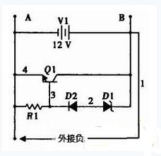 原理如圖2所示,圖中的Q1、D2、D1組成保護(hù)電路,其中D1(1N4743)為穩(wěn)壓管二極管(+13.5 V),D1和D2共同組成三極管Q1的偏置電路。R1是Q1管的限流電阻。電路外接充電器充電時,如電池的最高閾值電壓在14.4 V左右,在充電初期蓄電池按常規(guī)的欠壓狀態(tài)慢慢上升,當(dāng)電池電壓達(dá)到穩(wěn)壓管D1的擊穿電壓時,D1管開始導(dǎo)通,此時Q1管也導(dǎo)通,促使A、B端電壓下降,設(shè)置合適的參數(shù)使電池兩端電壓最高值不會大于14.4 V。在蓄電池已充滿時保護(hù)電路會使蓄電池處于涓流充電狀態(tài),這就使電池具有充電保護(hù)功能。