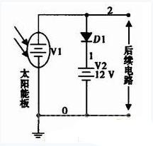 當(dāng)電池兩端電壓高于太陽能板兩端電壓時,可能會產(chǎn)生電池給太陽能板反向充電現(xiàn)象。一旦發(fā)生這種現(xiàn)象,太陽能板很有可能被燒壞,造成損失。因而,過充保護(hù)電路還應(yīng)該包括防反充電路,即在太陽能板和電池之間連接一個二極管來防止電池對太陽能板反向充電,如圖3所示。