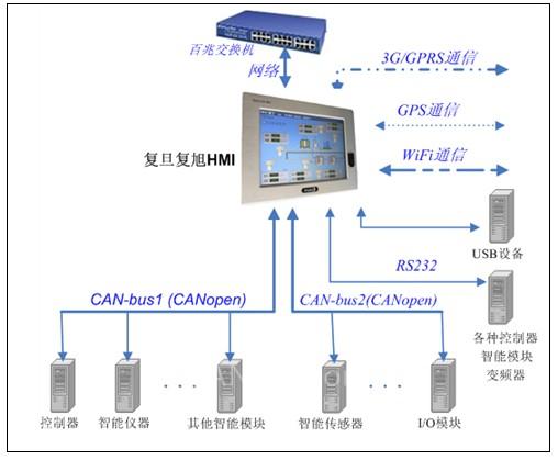 用戶采用復(fù)旦復(fù)旭公司的現(xiàn)場(chǎng)總線型高端HMI,可以非常容易實(shí)現(xiàn)與全球各國(guó)際公司的各種標(biāo)準(zhǔn)設(shè)備之間的通信,可以連接任何公司的標(biāo)準(zhǔn)CAN-bus控制器、傳感器,實(shí)現(xiàn)系統(tǒng)間的互聯(lián),以完成實(shí)現(xiàn)設(shè)備系統(tǒng)的升級(jí)換代和智能監(jiān)控。