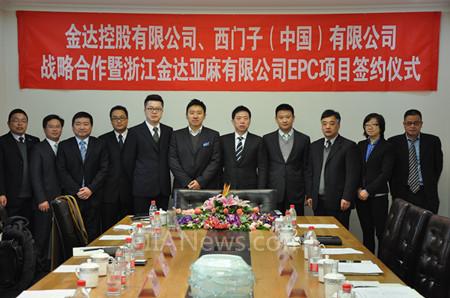 西門子與全球最大亞麻生產(chǎn)商金達(dá)控股有 限公司深化戰(zhàn)略合作,西門子(中國)有限公司工業(yè)業(yè)務(wù)領(lǐng)域銷售集團華東區(qū)總經(jīng)理劉志生(右四)、金達(dá)控股有限公司董事局主席任維明(右五)、金達(dá)控股有限公司執(zhí)行董事兼總經(jīng)理沈躍明(右三)以及浙江金達(dá)亞麻項目總負(fù)責(zé)人王明浩(左一)出席了簽約儀式。