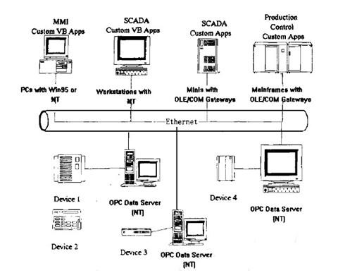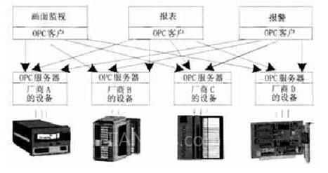 對于硬件設備廠家來說, 采用OPC 技術(shù)意味著他們只需開發(fā)一個符合OPC 規(guī)范的OPC 服務器, 該服務器可與所有的OPC 客戶程序通訊, 這些OPC 客戶程序可以是DCS 或SCADA 程序, 也可以是其他