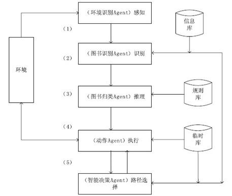 (1)當(dāng)機(jī)器人的機(jī)械手拿一本圖書時(shí),機(jī)器手上的自動(dòng)識(shí)別系統(tǒng)即帶有傳感器的環(huán)境識(shí)別Agent 立即感知環(huán)境變化,且獲取圖書條形碼信息,并將這些信息傳遞給圖書識(shí)別Agent.這一過程主要是實(shí)現(xiàn)從環(huán)境狀態(tài)(E)到感知(Per)的映射(函數(shù)see 的輸出是一種感知,即感知的輸入):see : E--> Per.