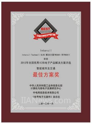 全球高性能模擬混合信號半導體設計和制造領導廠商Intersil公司(納斯達克全球交易代碼:ISIL)今天宣布,其Intersil Techwell SLOC?解決方案在工信部計算機與微電子發(fā)展研究中心、中電網(wǎng)信息技術有限公司和《世界電子元器件》雜志社共同舉辦的2012全國優(yōu)秀IC和電子產品解決方案評選活動中榮獲“智能城市及交通方案”類“最佳方案”獎。