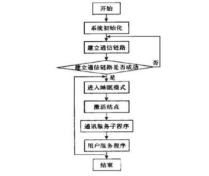 傳感器、調(diào)節(jié)器節(jié)點(diǎn)的數(shù)據(jù)發(fā)送和收集、主程序處理模塊和通信服務(wù)子程序這四個(gè)部分是構(gòu)成無(wú)線檢測(cè)終端軟件系統(tǒng)的主要部分。主程序處理模塊在軟件系統(tǒng)中主要負(fù)責(zé)功能模塊初始化,它還可以設(shè)置寄存器的工作模式和其他內(nèi)部微處理器的工作參數(shù)。之后就是數(shù)據(jù)的傳輸,建立通信鏈路,并保證數(shù)據(jù)在鏈路傳輸中的可靠性和穩(wěn)定性。通信服務(wù)子程序在軟件系統(tǒng)中主要負(fù)責(zé)數(shù)據(jù)的接收、處理、打包和發(fā)送,保證數(shù)據(jù)完整可靠的進(jìn)入用戶應(yīng)用程序,顯示和調(diào)用終端檢測(cè)信息,儲(chǔ)存數(shù)據(jù)到數(shù)據(jù)庫(kù)。如圖2所示為主程序處理模塊的流程圖。
