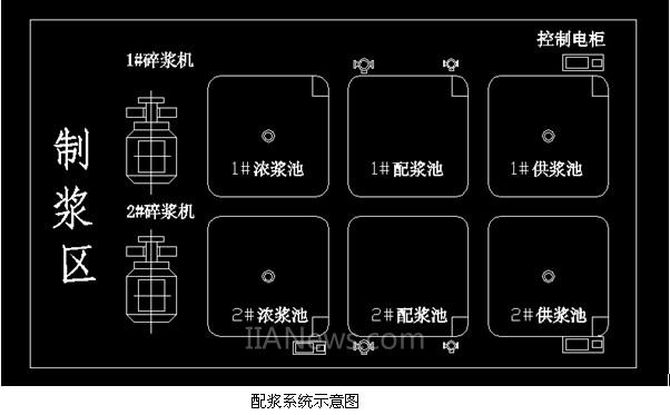 配漿系統(tǒng)介紹:22kw碎漿機半個小時可以生產(chǎn)紙漿55kg。漿池分為濃漿池,配漿池,和供漿池。三個漿池容積都為12m3。